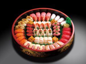 中トロ・北海道タコ・マグロ・熟成金目鯛・ハマチ・サーモン・炙りのどぐろ(もみじおろし・青ネギのせ)・大生エビ・炙り大エビ・北海道ホタテ・ネギトロ・イクラ・切玉子